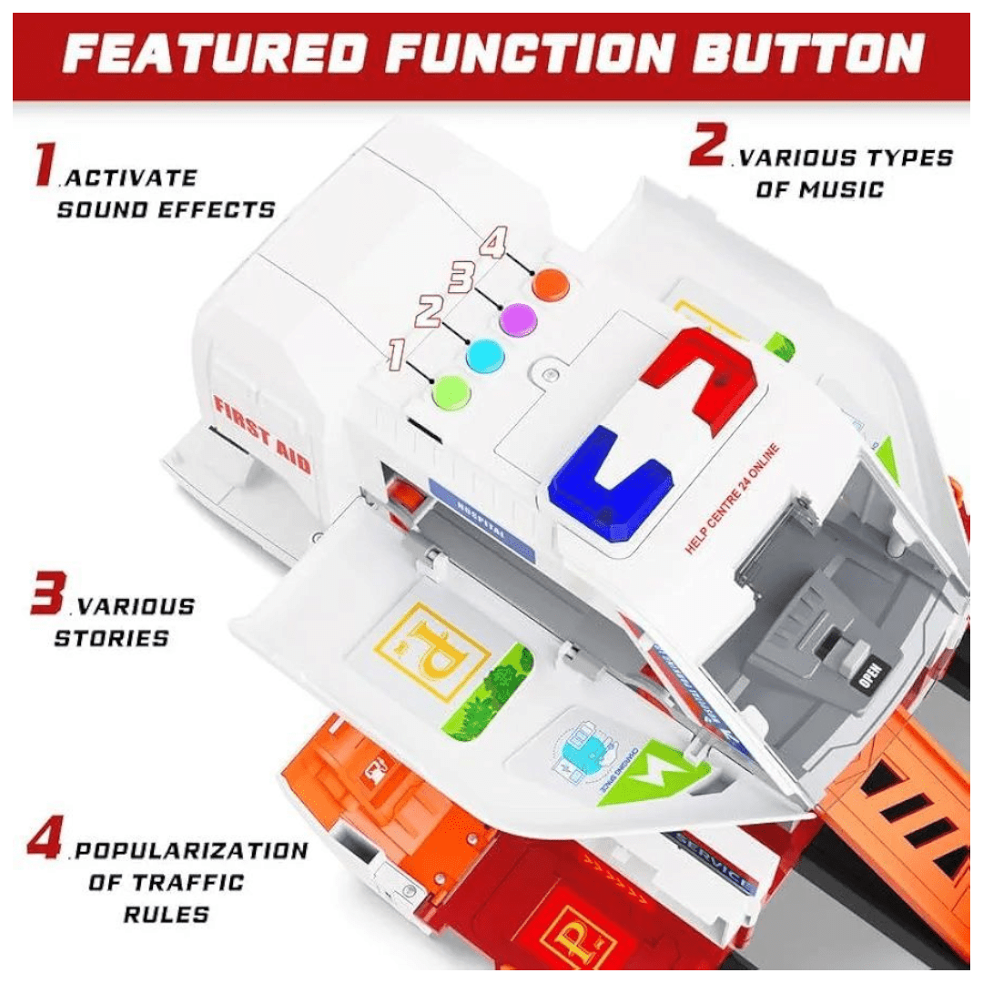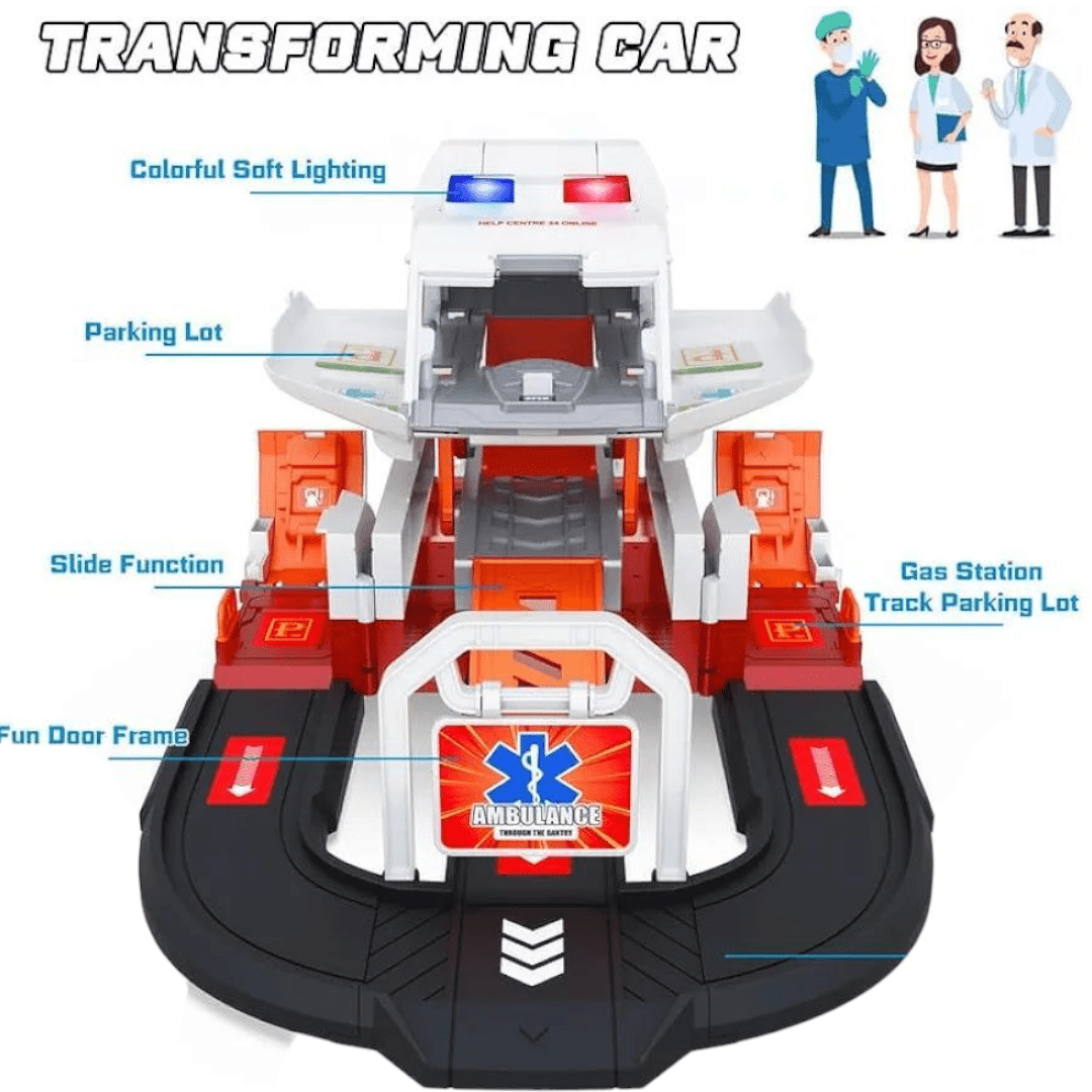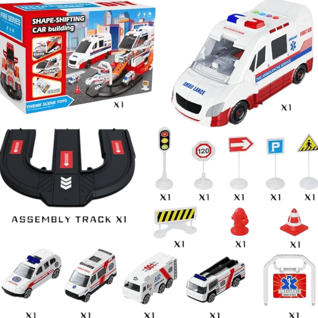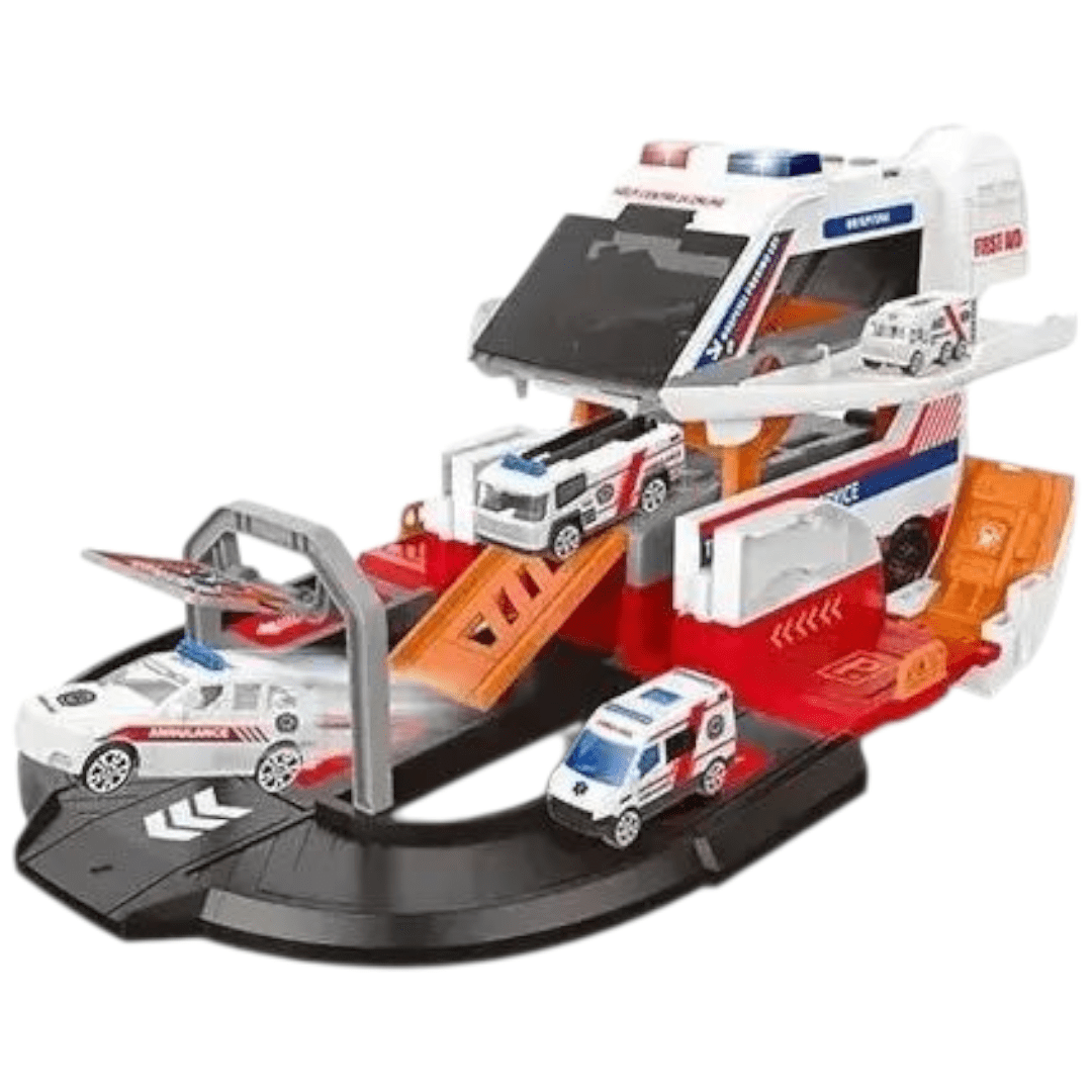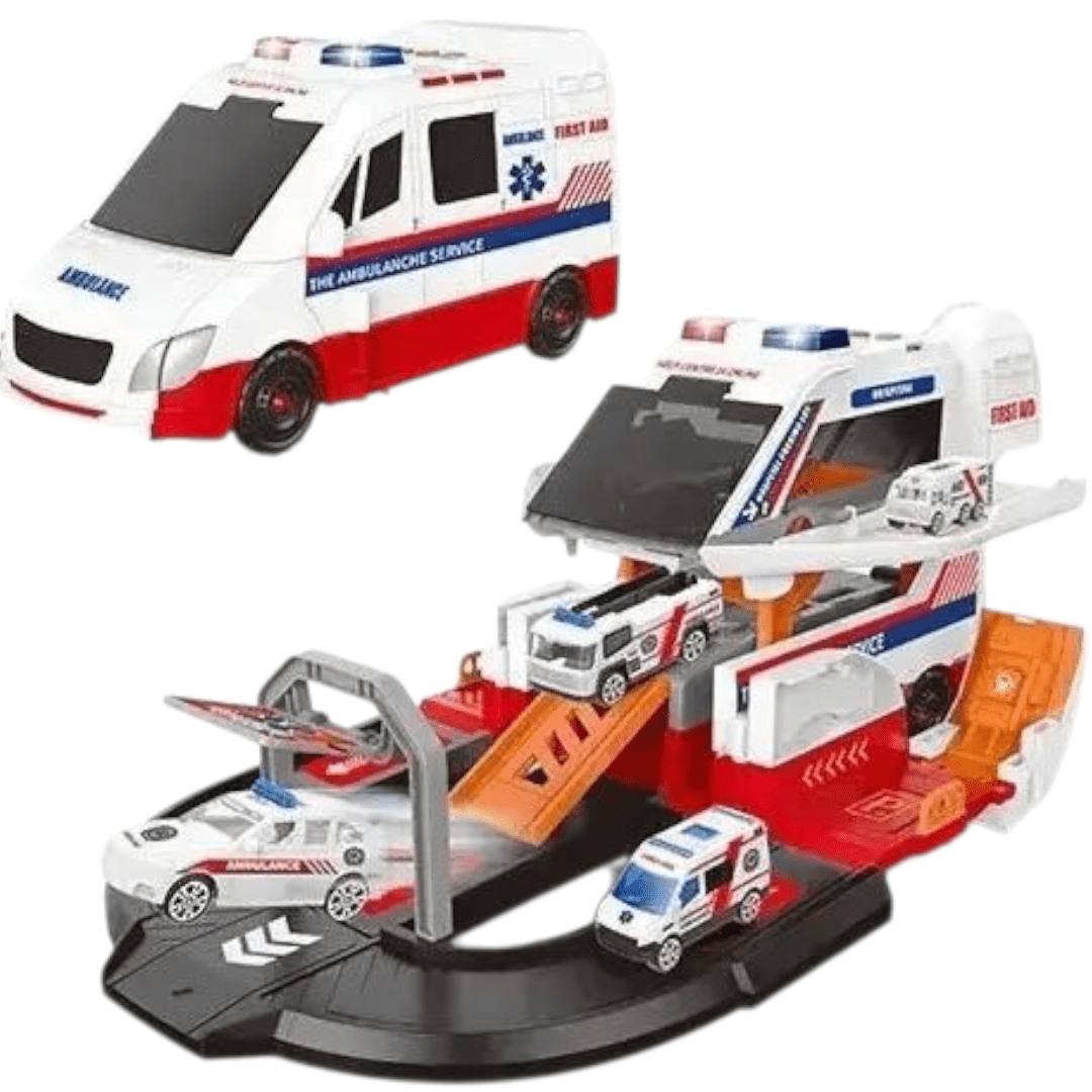Mega Ambulancia Transformable xon Sonidos y 4 vehiculos de rescate Tamaño de la caja 41x 20x 14cms