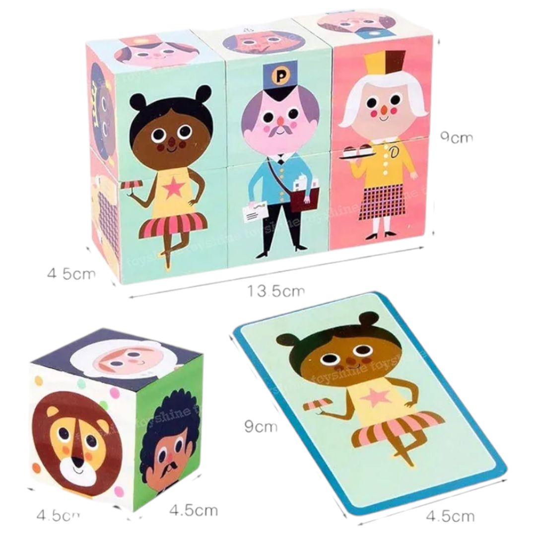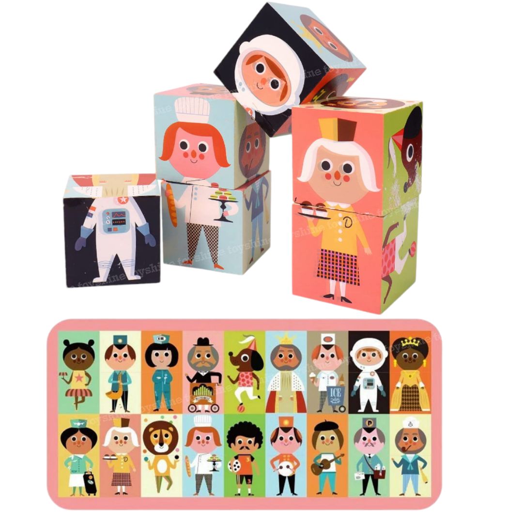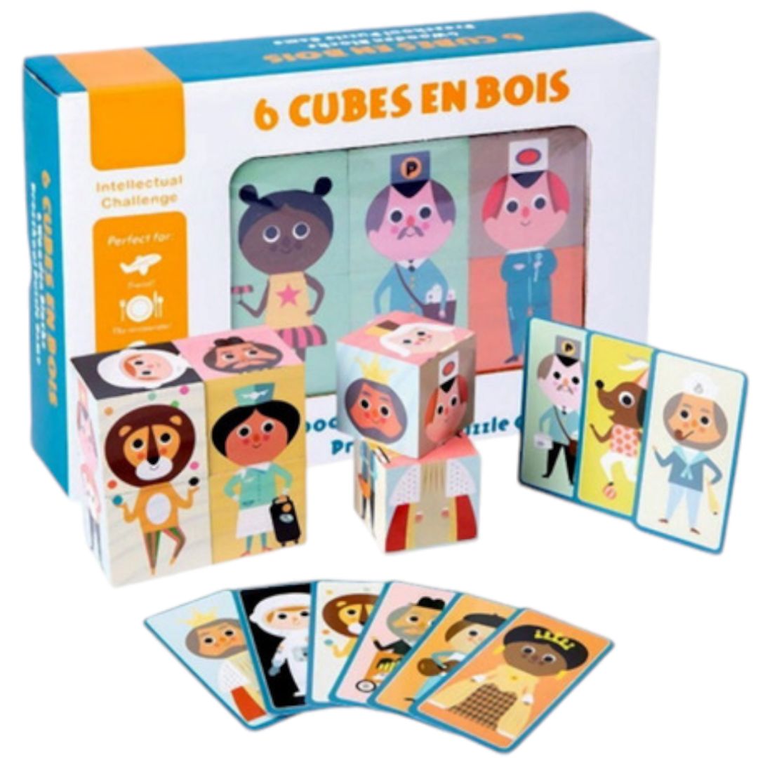 Éste puzzle compuesto por 6 cubos de madera acompañado de tarjetas ilustrativas, permite formar hasta 18 personajes con diferentes oficios
